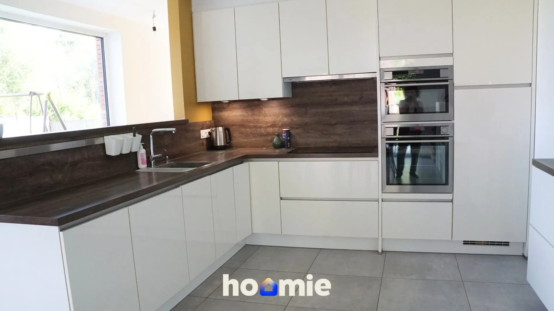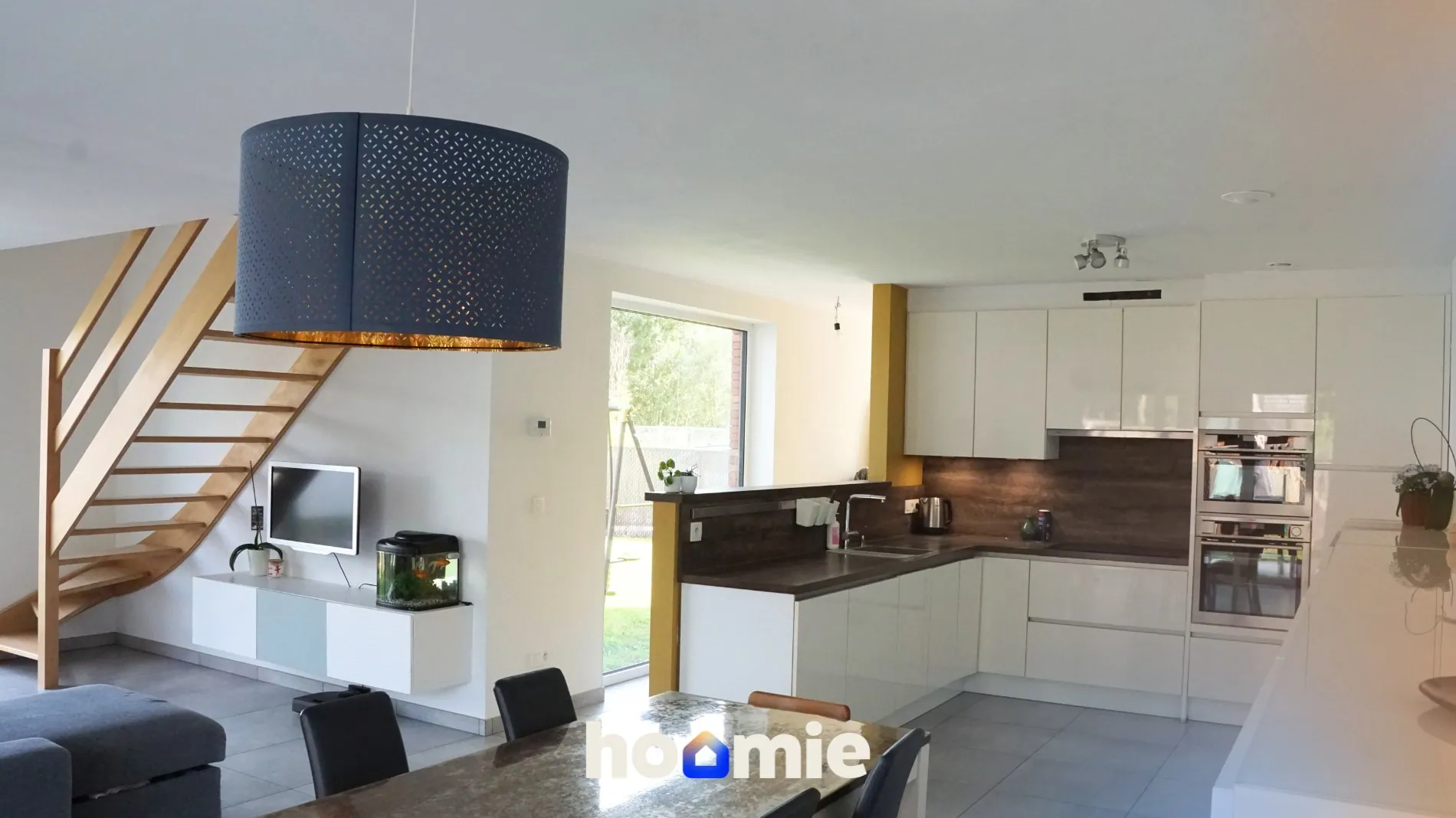 Deze moderne woning heeft een open indeling die zorgt voor een licht en ruimtelijk gevoel. De leefruimte sluit naadloos aan op de eetkamer, wat perfect is voor gezellige familiemomenten. De volledig ingerichte keuken is voorzien van moderne toestellen zoals een vaatwasser, combi-microgolfoven, combi-stoomoven en inductiekookplaat, ideaal voor kookliefhebbers.