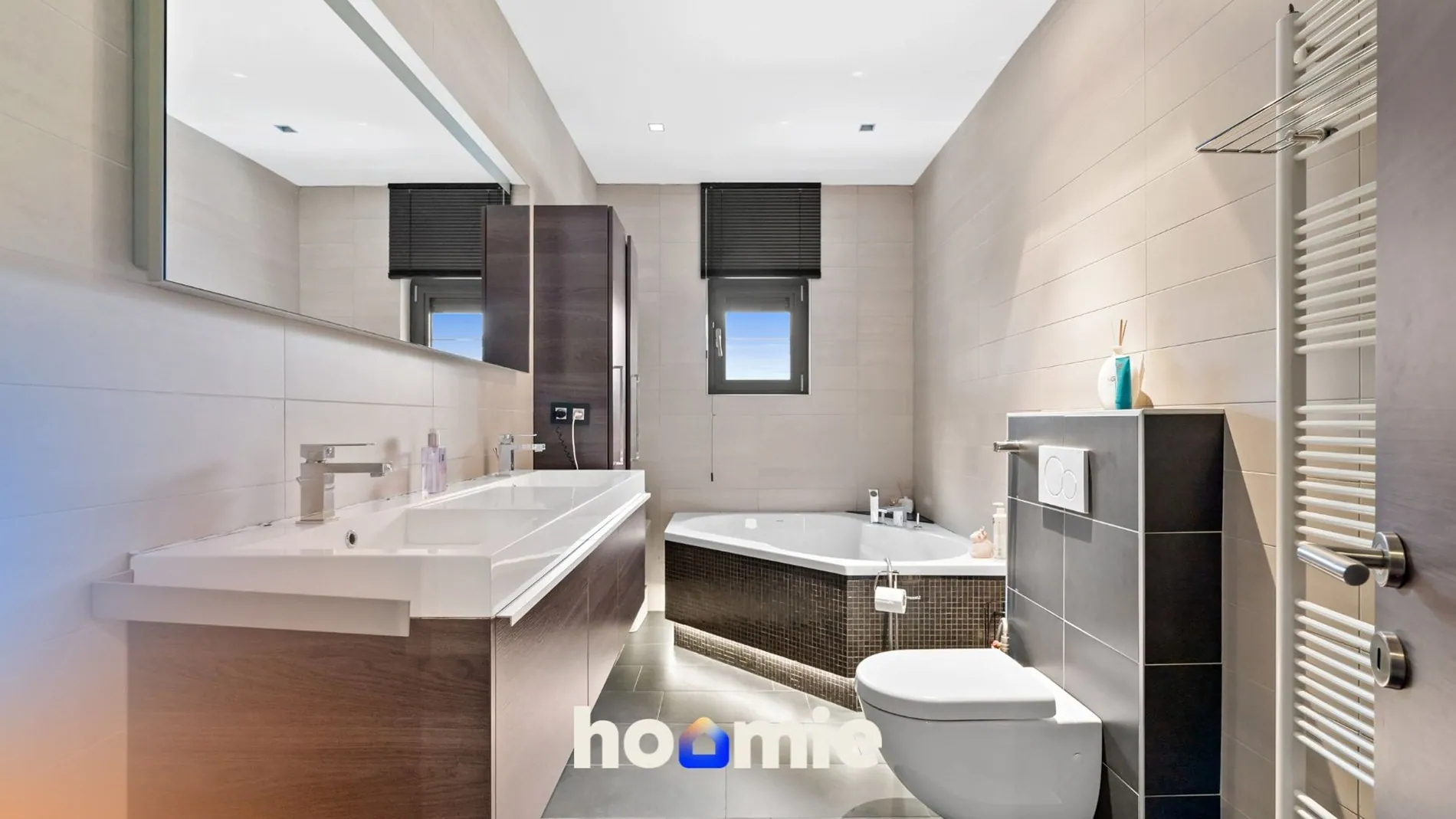 De eerste verdieping (± 55 m²) telt 3 volwaardige slaapkamers, waaronder een ruime masterbedroom van ca. 20 m² ... met mogelijkheid tot een terras boven de uitbouw 🌤️. De tweede badkamer is uitgerust met een hoekbad, dubbele lavabo en toilet. Via een luik is er toegang tot de bergzolder 📦.