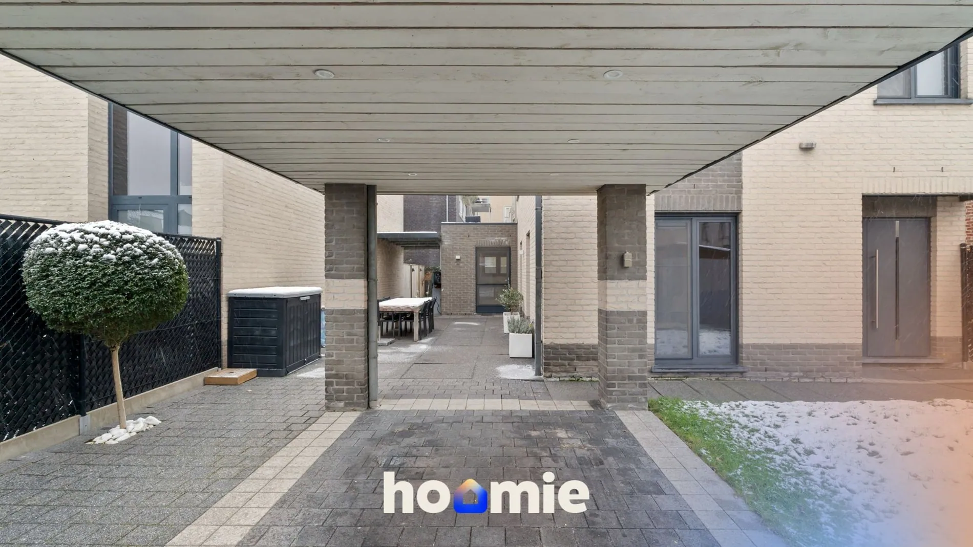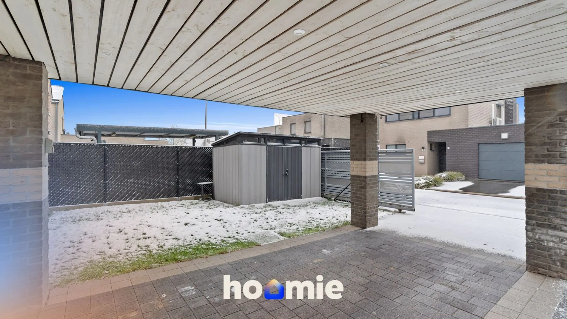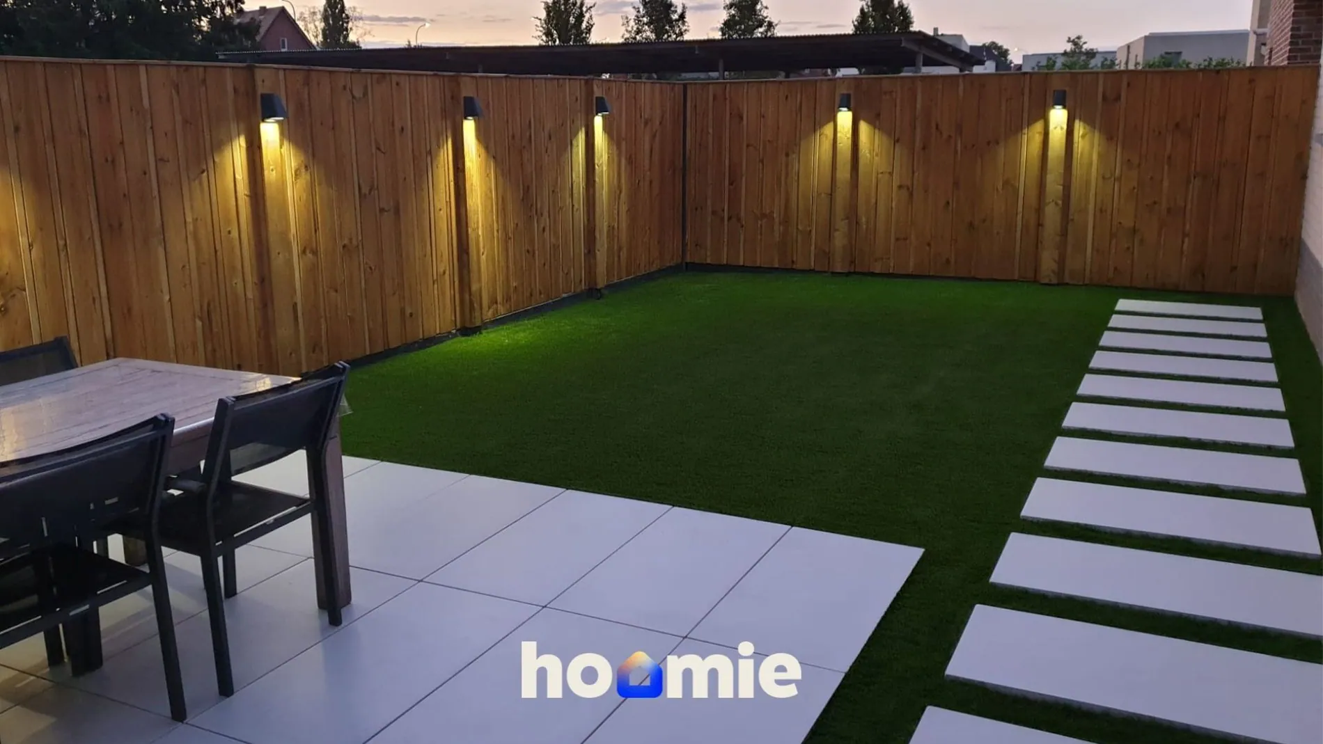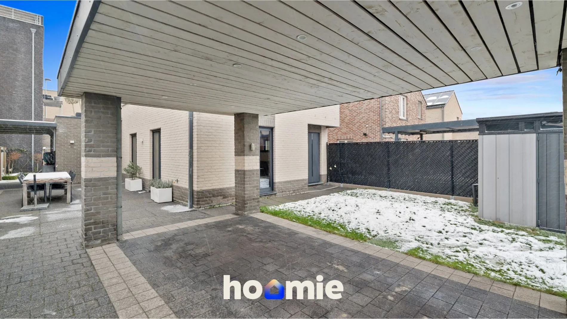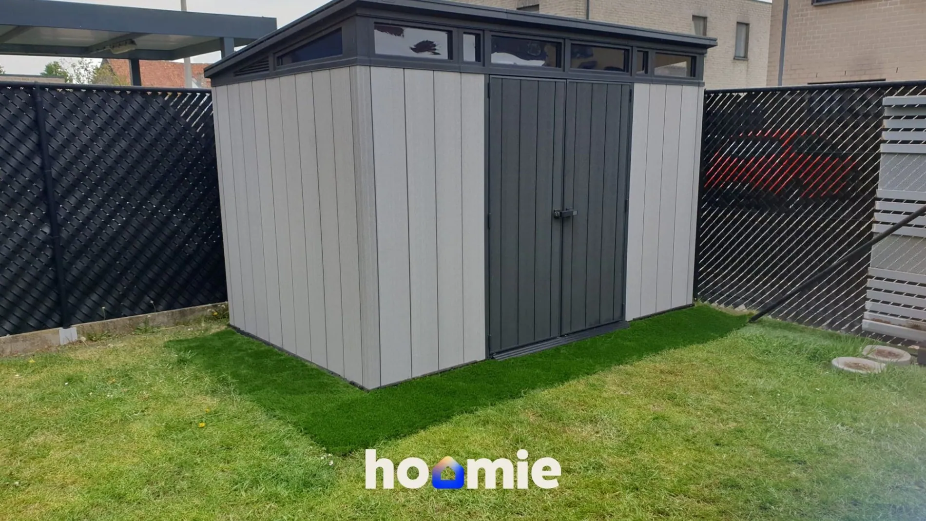Buiten geniet je van een onderhoudsvriendelijke tuin 🌳 met kunstgras, tuinverlichting, stopcontacten, 2 buitenkranen, een tuinhuis op chape en een carport van ca. 15 m². 🚗