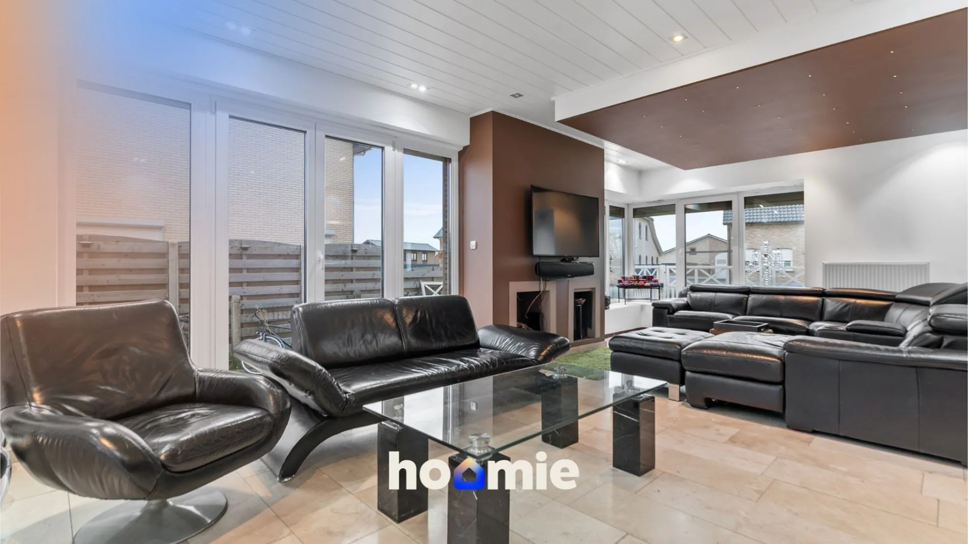 - Lichtrijke leefruimte met inbouwspots en veel raampartijen