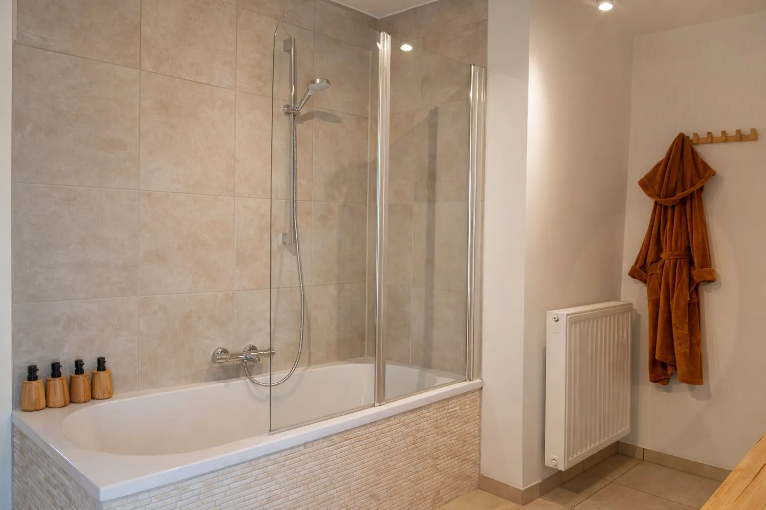 Aansluitend bevindt zich de volledig uitgeruste keuken met kwalitatieve Siemens-toestellen en een duurzaam composiet werkblad, ideaal voor wie graag kookt of gasten ontvangt. In de inkomhal vind je bovendien een gastentoilet en een praktische kast met alle nutsvoorzieningen.