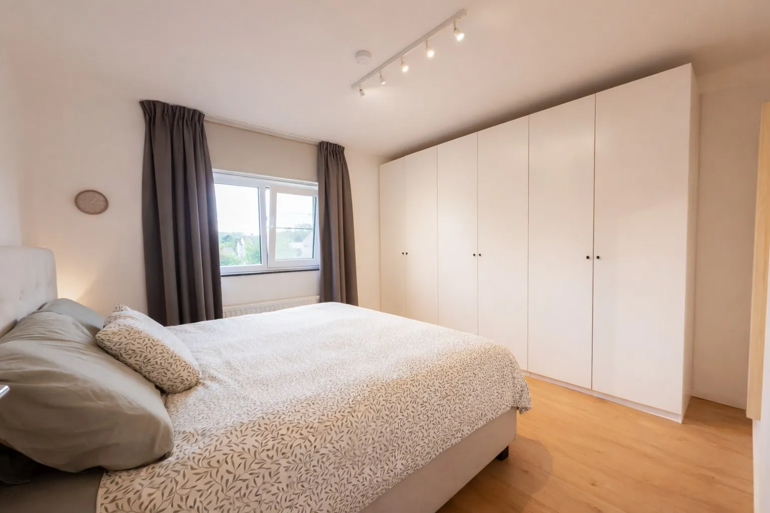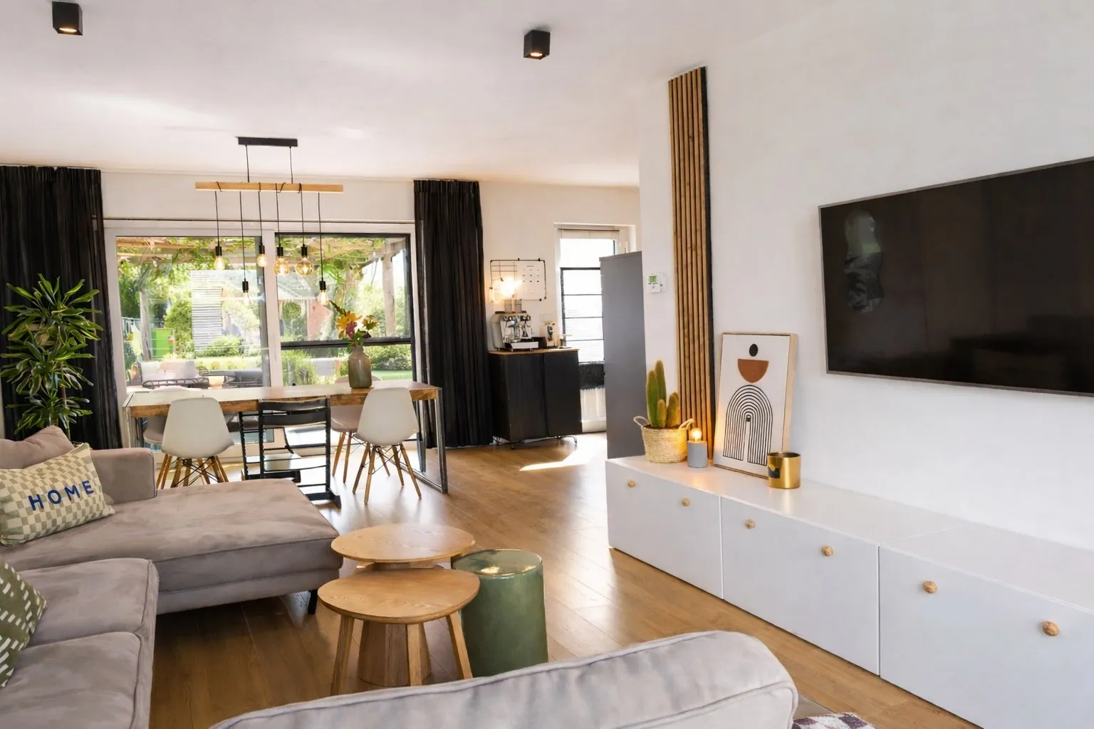 De lichtrijke leefruimte vormt het hart van de woning en is voorzien van vloerverwarming en dimbare verlichting, wat zorgt voor een warme en aangename sfeer. Grote raampartijen verbinden binnen met buiten en geven een open en ruimtelijk gevoel.