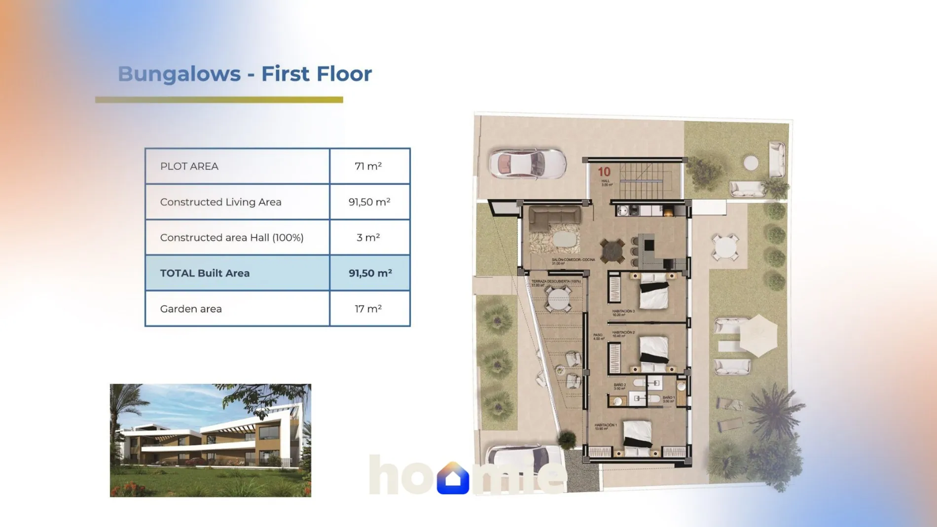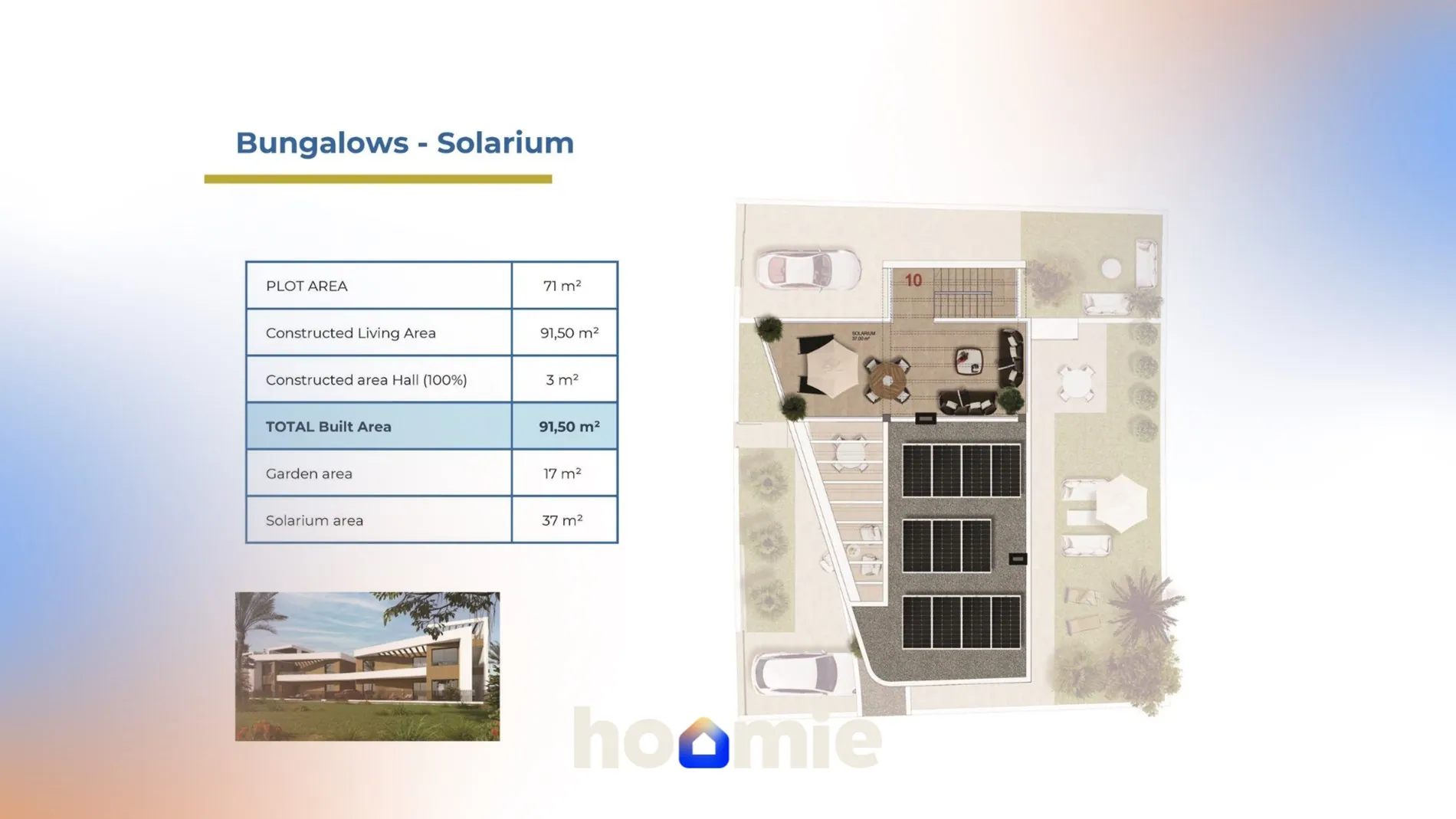 De bungalows op de begane grond hebben uitgestrekte hoektuinen met parkeerplaatsen, waardoor ze extra ruimte en privacy bieden. De bungalows op de bovenverdieping hebben ook een tuin met parkeerplaats en een privé solarium, waar je kunt ontspannen en in volledige afzondering van de zon kunt genieten.